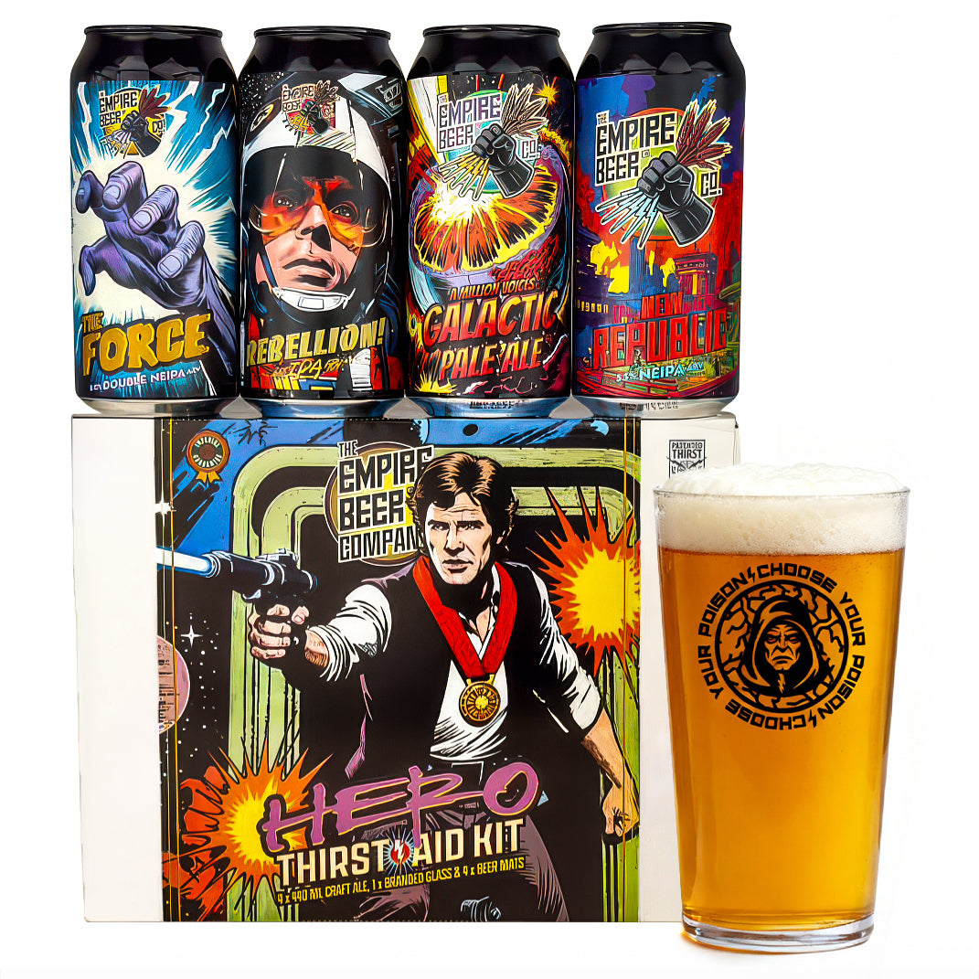 You're looking at it - The 'Hero' Gift Pack - our special Thirst Aid Kit to celebrate the Rebellion's finest. Featuring four 440 ml cans from The Empire Beer Co's core range, a branded craft ale glass and a four beer mats, all packed into a fabulous custom-sleeved gift box.